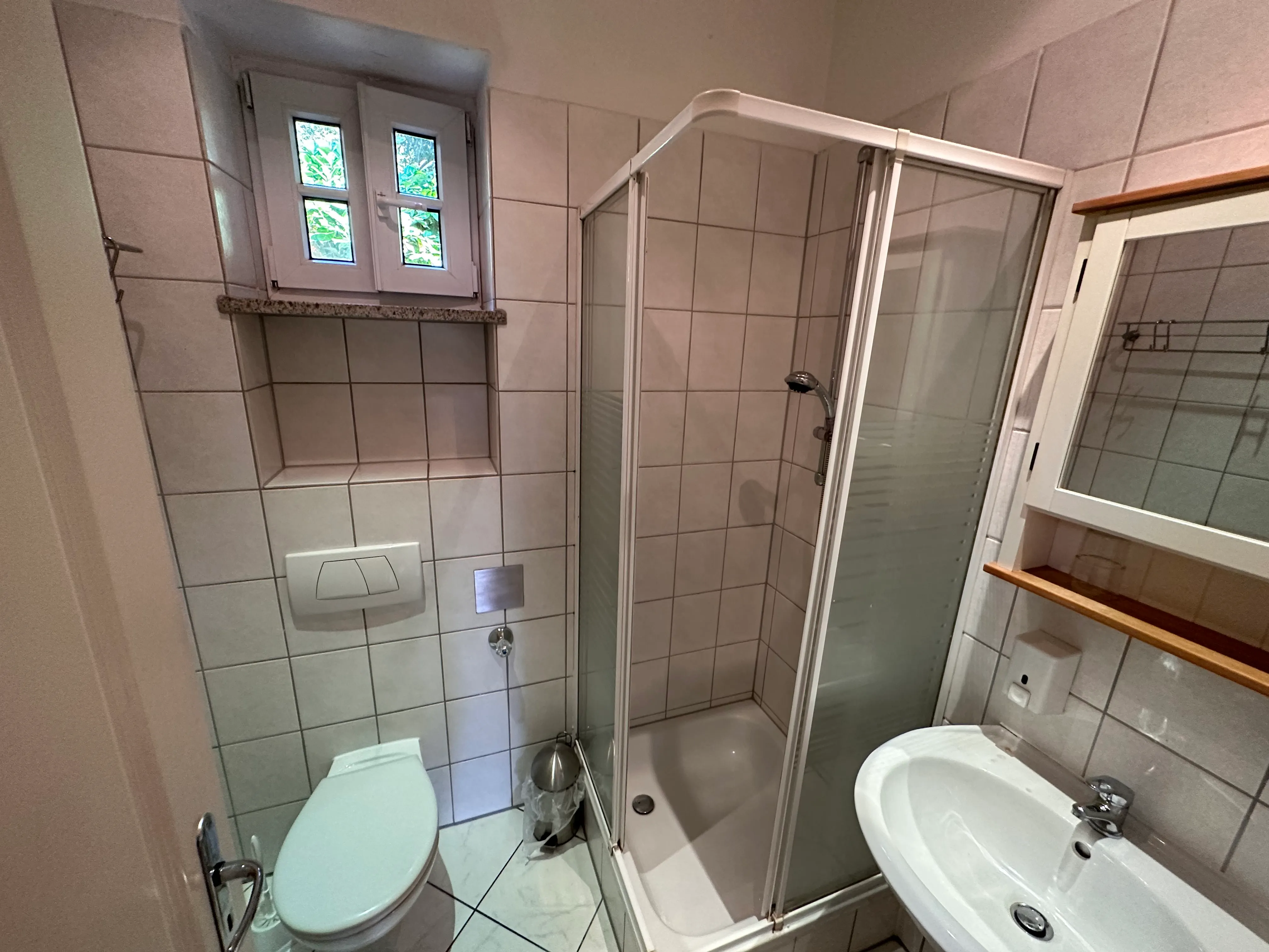 Das Badezimmer ist funktional eingerichtet und verfügt über eine Dusche, ein WC und ein Waschbecken. Damit steht Ihnen alles zur Verfügung, was Sie für einen frischen Start in den Tag benötigen.
